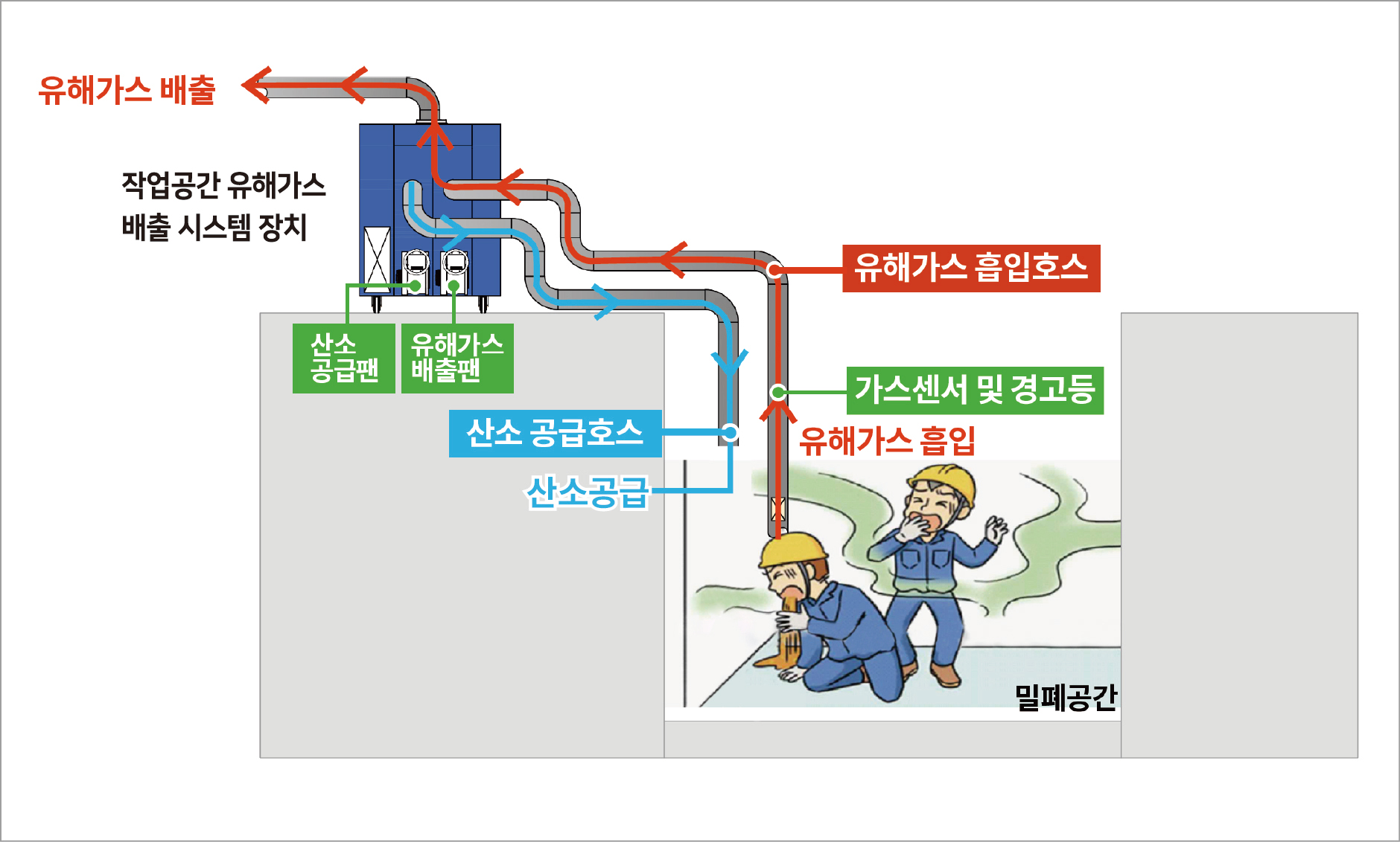 - ② 이때 작업자가 작업을 중지하며, 경고등과 동시에 흡입호스에서 유해 가스를 흡입시켜 현장 외부로 배출시킴.