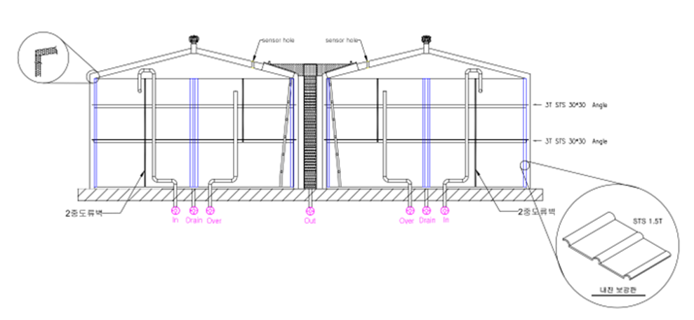 - STS 물탱크는 제작 설치 시에 여러 조각의 STS판재를 가공/용접함으로써, 용접부위에서 녹 또는 하자가 발생하고 있어 조립식 탱크가 보급되고 있음.