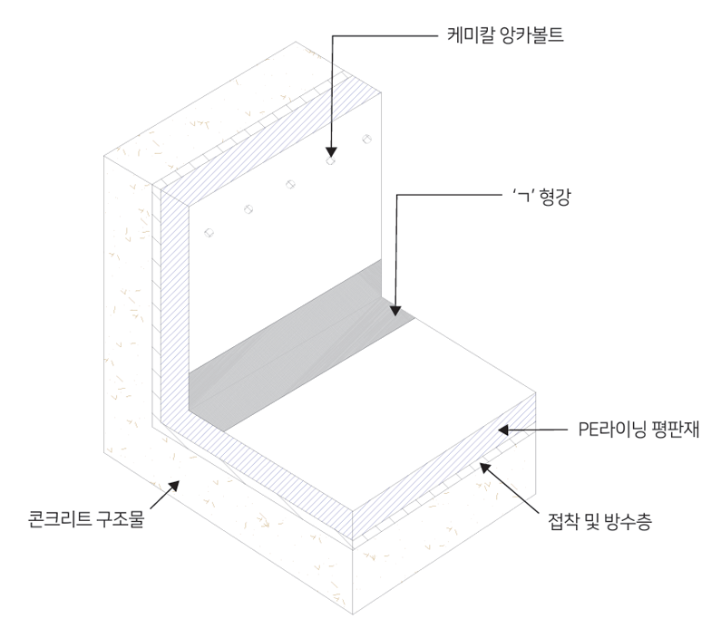 - 당사의 시공방법은 콘크리트면에 케미칼 앙카볼트를 부착 후 PE라이닝을 고주파 또는 열을 이용하여 융착하고, PE라이닝 시트를 맞대기 용접 방식으로 부착하는 “PE라이닝 보강 시스템” 임.